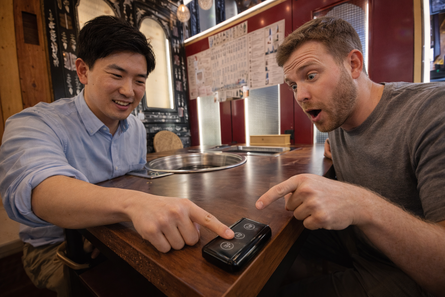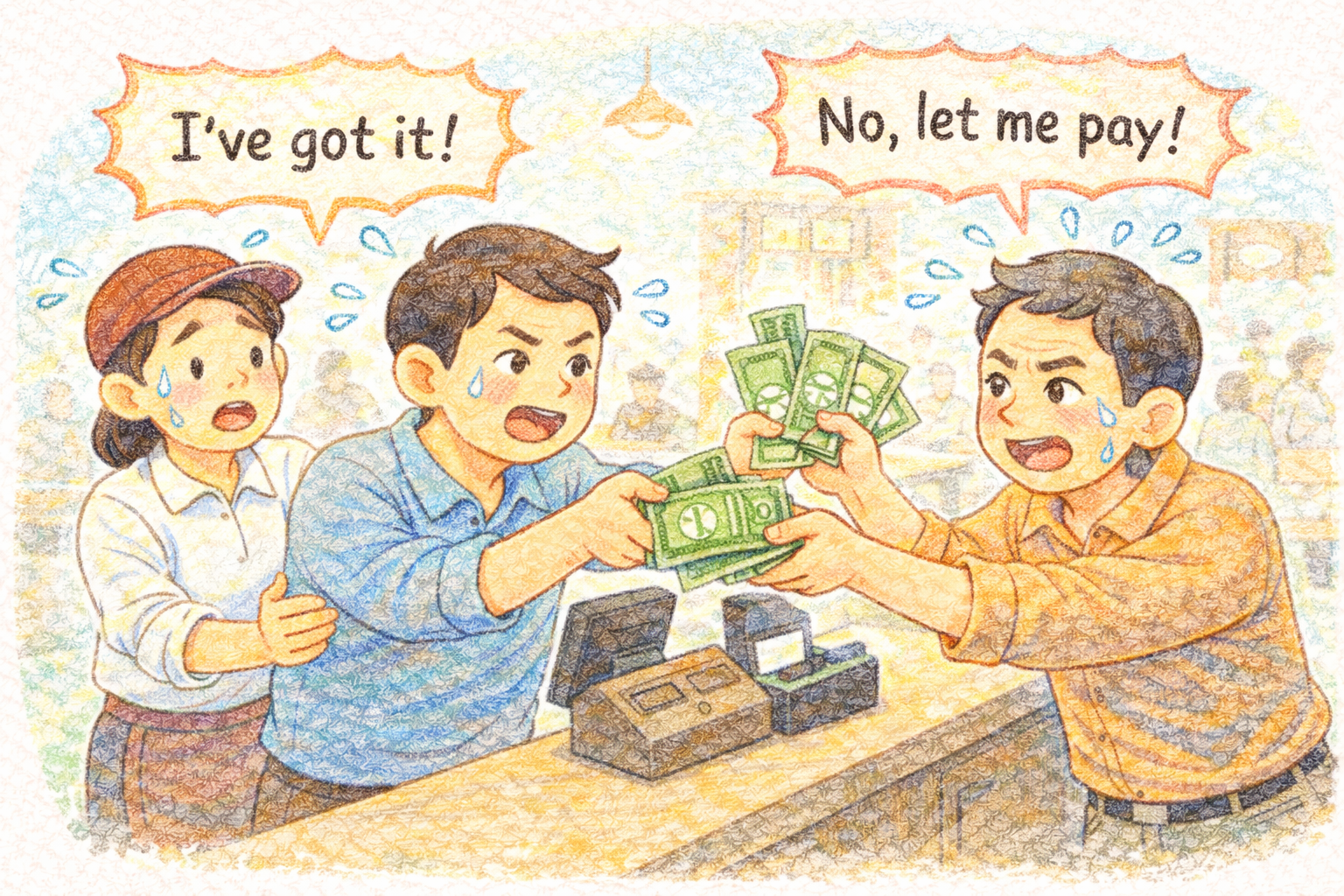 The Awkward Moment at the End of the Meal The food is gone.The table is quiet for a second. Then someone reaches for the bill. Immediately, another hand moves faster. “No, I’ll pay.” (내가 낼게)“No, no, I will.” (아니야, 내가 낼게) Voices overlap. Hands block each other. The cashier waits, already familiar with this scene.